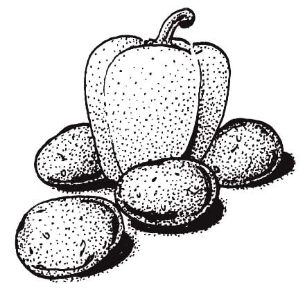 Add olive oil to large skillet over medium heat. Add garlic; heat until garlic begins to turn color. Use fork to remove garlic from oil. Add sliced bell pepper; briefly sauté until softened. Add potatoes. Cook 10 minutes, stirring occasionally to prevent scorching; add more olive oil if sticking. Remove from heat.
