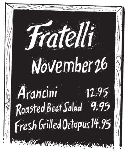 So, for example, because Matteo and Salvatore want guests to think of their ristorante as specializing in fresh, seasonally intense flavors, they decided to display their ever-changing daily menu on a large, freshly-written chalkboard in the dining room.