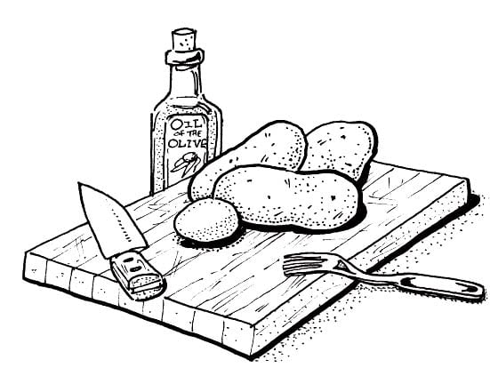 Scrub potatoes; make a long slit along one side. Bake at 375°F, 60 to 75 minutes, or until tender. Let cool slightly. Peel. Put through food mill into large bowl. Make a well in center of potatoes. Add 1 1/2 cups of flour, the egg yolk, olive oil, and salt. Mix thoroughly with hands. Turn out onto wooden board and knead 4 to 5 minutes or until smooth, adding a little more flour if necessary. Dough should be cohesive, elastic, and smooth. Divide dough into 4 portions. Roll each portion into a rope, about 3/4″ in diameter. Slice into 1″ pieces, and roll each piece over the back of the tines of a dinner fork. Cook in boiling, salted water just until gnocchi rises to surface; drain.