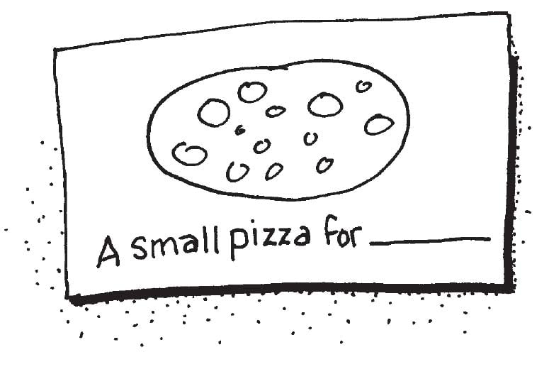 To build local awareness, pizzeria manager Michael Napier wears his logoed shirt while running errands around town. After noticing how many children ask, “Can I have some?” after reading “pizza” on his shirt, Michael printed a child’s drawing of a pizza, “A small pizza for____” and a blank to write the child’s name on the back of his business cards.