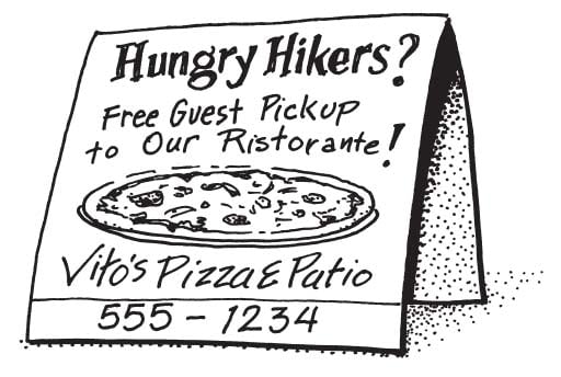 As the “Appalachian Trail” passes through Franklin, NC, distance hikers often check into local hotels for a hot shower and soft bed. Recognizing potential guests without wheels, Vito LoMonaco places laminated flyers in area inns, describing his pizzeria and offering “Free Guest Pickup and Drop Off to Local Hotels.” As a result, a growing number of hikers are coming to enjoy a hot, hearty Italian meal before continuing on their way. And word of mouth is spreading up the trail that Vito’s is hiker friendly!