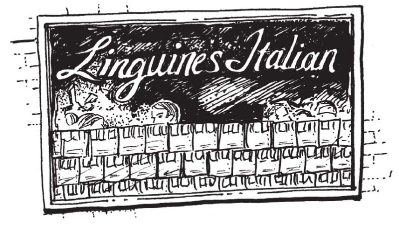 Restaurant windows do not always offer diners the most attractive view. To hide a busy parking lot from his guests, Vinny Desiderio built a low “privacy screen” by stacking attractively labeled ingredient cans three layers high within his front windowsills. (While they may look full, the cans were emptied from the bottom for safety.)