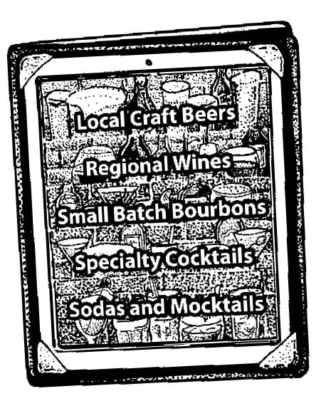 To manage their ever-changing collection of premium adult beverages, Melissa and Eric have invested in digital iPad bar menus. Reflecting their building’s historic vibe, each iPad is covered in a custom leather “book” cover.