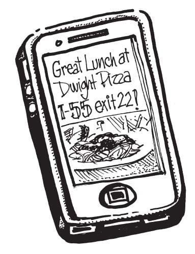 Truckers and other motorists often stop in Dwight, IL, while driving the interstate between Chicago and Springfield, IL. Since fellow truckers frequenting the same highway often become friends, John Nakashima gives them a free soda if they “tweet” or “instagram” a photo of their meal with his restaurant name and location to their buddies. By encouraging word of mouth among drivers visiting Dwight several times monthly, John is attracting a growing share of their repeat business!
